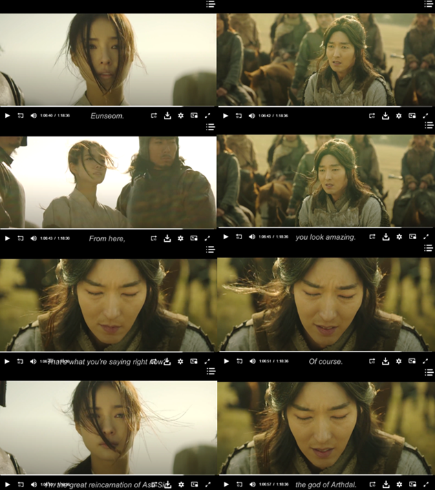 In an exciting sequence in the war between the twins, Inaishingi whispers to Douri or Kanmoreu to rear in the air. He repeated his instructions to the stallion to repeat his amazing feat. It was an impressive sight as the horse reared with its front legs high in the air. The Arthdal horsemen fell to the ground and in the end, Kanmoreu, the legendary divine horse, lured the Arthdal horses to the Ago camp.